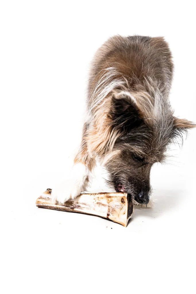 Bison Marrow Bones! Utilizing even more of local, Colorado Bison with hindshank and femur marrow bones. From the slow-roasted bison on the outside to the rich, delicious marrow on the inside. Our new bison marrow bones will keep dogs occupied and happy for hours!